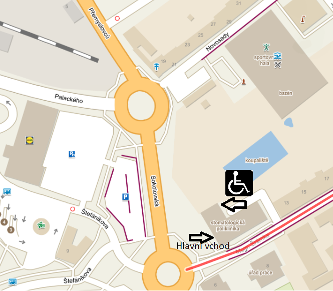 Sídlíme na Stomatologické poliklinice v Novém Jičíně. Naše ordinace je umístěna ve zvýšeném přízemí. Po vstupu do budovy hlavním vchodem z ulice Sokolovská vyjdete několik schodů. Po pravé ruce uvidíte prosklené dveře a za nimi čekárnu, kterou sdílíme s fyzioterapií.